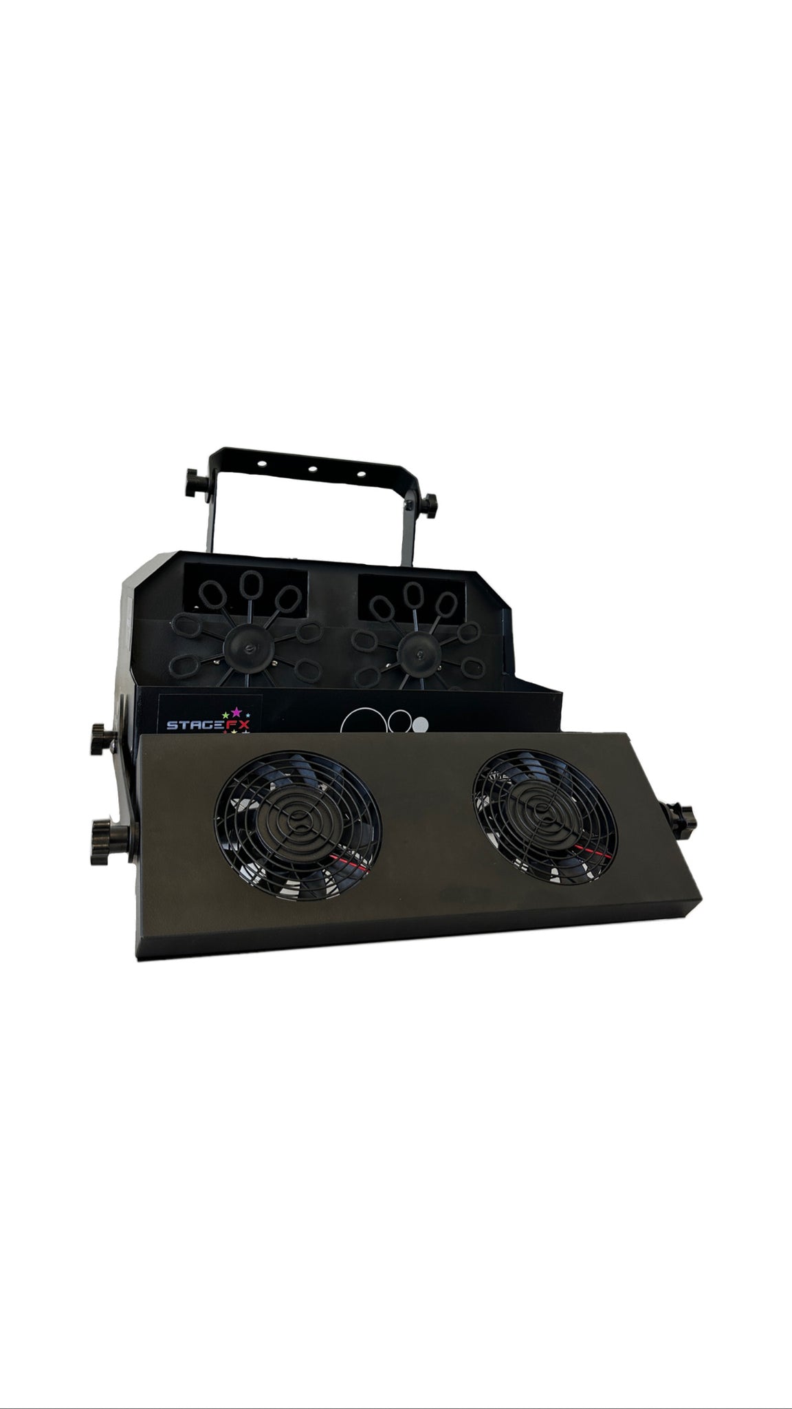 A bubble machine with an adjustable fan to control the length of output.